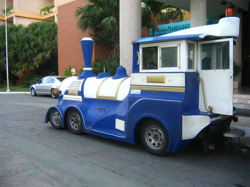 Голубой паровозик с вагончиками для перевозок туристов между отелями
