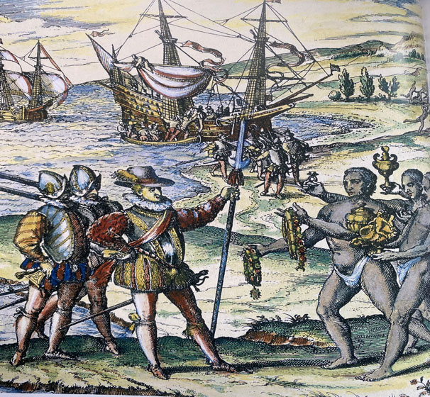 Гравюра на меди работы Теодора де Бри (1594): «Прибытие Христофора Колумба в Америку 12 октября 1492 года (первая экспедиция).
