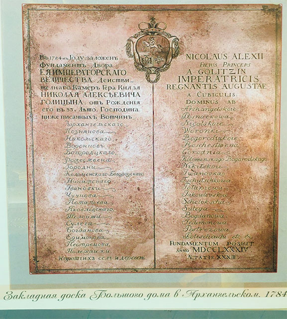 В 1780 г. в Париже князь приобрел для строительства своего загородного дома проект архитектора Шарля Герна, положив этим начало знаменитому архитектурно-парковому ансамблю в Архангельском. В ходе реставрации дворца в 2003 г. была обнаружена украшенная гербом рода Голицыных медная закладная доска, указывающая точную дату начала строительства здания – 1784 год!