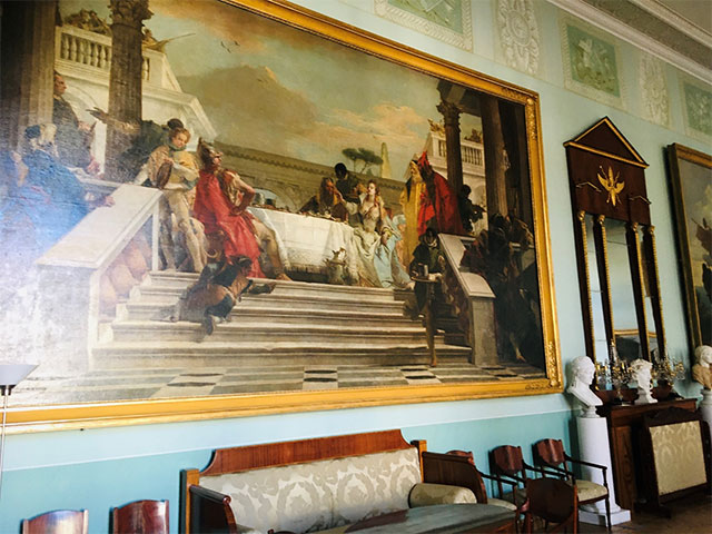 Поражает отделка парадной столовой; здесь роспись занимает всю высоту стен, ее охристо-розовый колорит насыщен. А изобразительные мотивы взяты из декорации египетских дворцов эпохи римского господства. Сквозь проем, соединяющую столовую с Буфетной, виден пейзаж, иллюзорно напоминающий о близости парка. К юбилею музея в залах разместили все экспонаты в том порядке, в котором они находились на старых фотографиях дворца более чем столетней давности, в зале Тьеполо я с удовлетворением отметил полотна с Клеопатрой, которые 10 леи назад наблюдал в запасниках Колоннады.