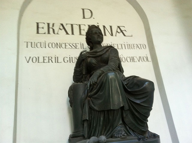 Зайдя на небольшую территорию вокруг храма, я увидел, что и он тоже закрыт строительной ограждающей сеткой, а на лесах рабочие покрывали листами яркой меди головки куполов. По узкой каменной дорожке можно было обойти вокруг храма и со стороны Москвы-реки, где находилась могила Татьяны Николаевны Юсуповой (14.02.1866–15.06.1888), родной сестры Зинаиды, умершей молодой, там я с удивлением обнаружил, что на могиле стоит новая копия надгробной статуи девушки-ангела работы Марка Антокольского, ранее в мои прошлые приезды сюда ее не было.