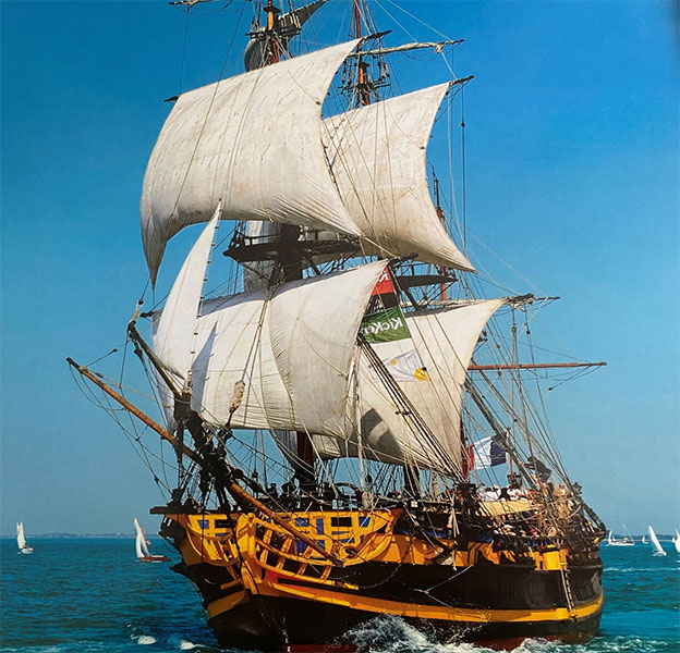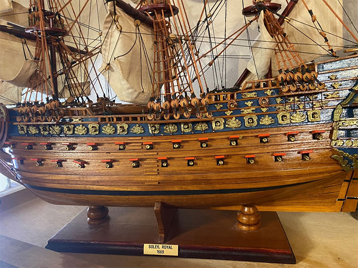 Помню, как часами рассматривал макет французского парусника «Soleil Royal» («Королевское солнце»). Построенный корабельным мастером Лораном Хубаком на верфи в Бресте, он был спущен на воду в 1669 году и вошёл в состав французского флота. Это был трёхмачтовый парусный корабль, нёсший на трёх деках (палубах) 110 пушек калибра от 4 до 36 фунтов. Художественное оформление его корпуса считалось самым красивым и сложным для того времени. Гальюнная (носовая) часть корабельная фигура в виде «солнца» была выбрана по настоянию короля Людовика XIV, как его личный символ. Печальна судьба этого красивейшего корабля. Поначалу он долго стоял в гавани Бреста для парадных целей, затем был перевооружён. Линейный корабль «Солей Рояль» участвовал потом всего в двух сражениях при Бичи-Хед и Барфлёре. В сражении при Барфлёре 29 мая 1692 года корабль был сильно повреждён, не мог возвращаться в Брест и был высажен на мель у Шербура для ремонта. В ночь со 2-го на 3 июня корабль «Солей Рояль» подвергся нападению английских брандеров и был сожжён. Из экипажа, состоявшего из 883 человек, спасся лишь один.
