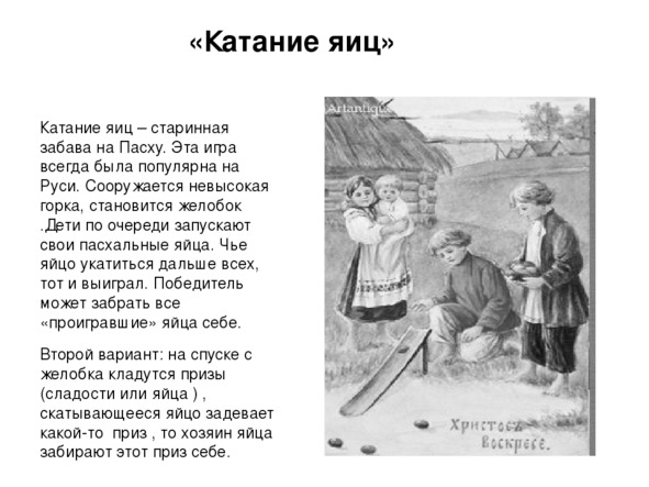 В другом варианте игры на ровном месте вокруг «катка» раскладывали небольшие игрушки и другие простые сувенирчики. Если яйцо, которое ты покатил, задело игрушку – она твоя! Многие более опытные игроки, выбирали яйца особой формы, чтобы легко разбивали другие яйца, а сами оставались целыми. Чтобы направить движение яйца в нужную сторону, необходимы сноровка и ловкость. Игра вызывала много веселья и смеха и доступна всем, даже самым маленьким в семье.» Я помню, в начале весны, как только появлялись первые проталины, дети и молодежь шли на выгон, где начинали играть в лапту, городки и подпалки, ножички. Современная молодежь сейчас и не знает о существовании таких игр.