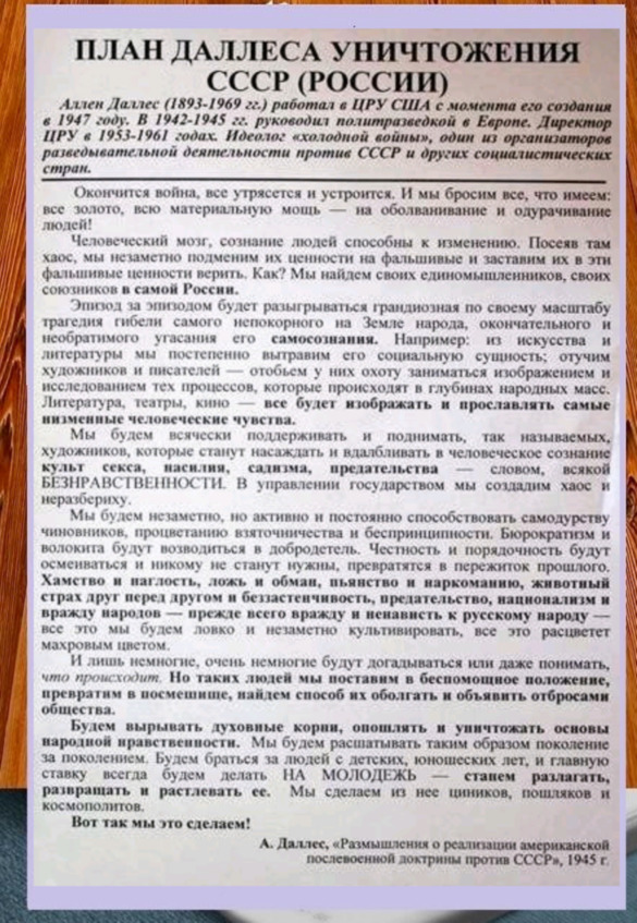 В подтверждение вышесказанного приведем выдержку из секретного материала, бывшего директора ЦРУ и руководителя политической разведки США, составленного в 1945 году и озаглавленного «Американская доктрина борьбы против СССР». Некоторые ошибочно считают, что такого документа не существовало. Между тем в нем говорится: «Мы бросим все, что имеем, все золото, всю материальную мощь на оболванивание и одурачивание людей. Человеческий мозг, сознание людей способно к изменению. Посеяв хаос, мы незаметно подменим их ценности на фальшивые…