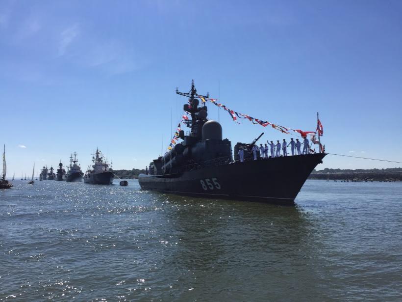 Идём, такие гордые, машем публике, публика радостно машет нам, настроение праздничное. В параде присутствовал даже (судя по флагу) шведский экипаж. Прошли, плавно повернули и вдоль строя боевых кораблей. Так же приветствуем экипажи, они приветствуют нас. Постарались сильно не задерживаться, чтобы у моряков быстрее закончилась торжественная часть и наступил праздник.