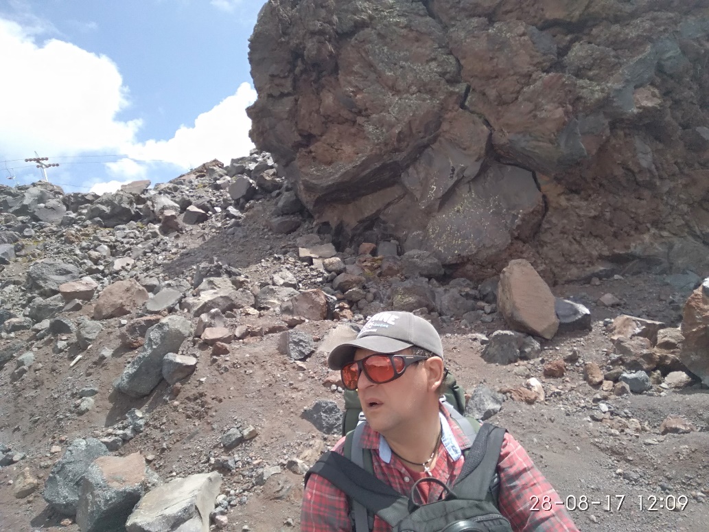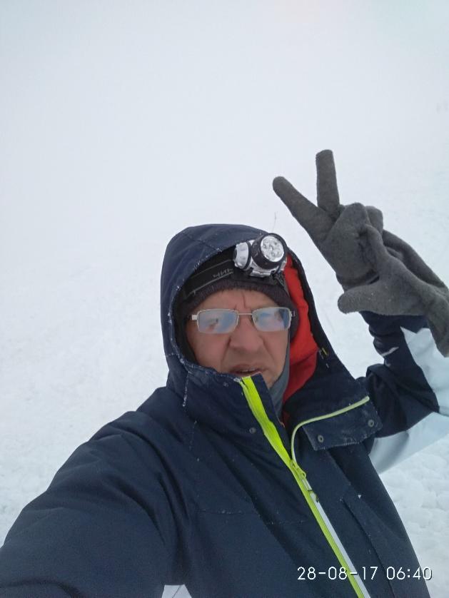 Светало, свет фонарика понемногу становился бледнее. Есть такое время суток, когда солнце светит ещё недостаточно, а искусственный свет- уже недостаточно. Этакий переход между днём и ночью. Вместе с этим переходом Эльбрус накрыла непогода. Вероятно, это было облако. Иногда шёл мелкий снег. Настолько мелкий, что совсем лёд. Нет, «шёл» это неправильно, он нёсся. И, как всегда бывает в таких ситуациях, он нёсся мне навстречу. Вспомнился «Закон езды на велосипеде» – «Если вы едите на велосипеде, то всегда в гору и против ветра». Велосипеда у меня не было, но я шёл в гору, по склону и против ветра.