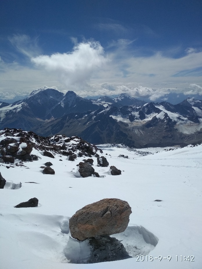 В один из моментов, когда я пропускал очередную организованную группу, которая уже взошла и шла обратно, я решил передохнуть чуть дольше, чем просто постоять. Справа из снега торчали несколько достаточно крупных камней. Крупных настолько, что на них можно было присесть. Дошёл, присел, камень покачнулся. Оказалось, что он не прикреплён к склону и лежит абсолютно свободно. Ниже меня и камня продолжали подниматься и спускаться редкой цепочкой альпинисты. Почему-то пришла мысль, что если камень покатится, то может кого ни будь задеть. А если наберёт скорость, то заденет сильно. Перекатился с камня на четвереньки, аккуратно встал, пошёл повыше. Второй камень был связан со склоном надёжнее. Не шатался.
