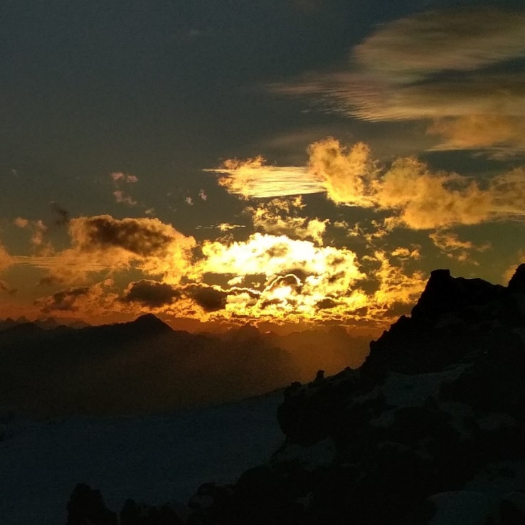 До бочки дошёл уже ближе к вечеру. Переоделся, поужинал и пошёл любоваться закатом. Там, где-то далеко за горами – Чёрное море. Мне рассказывали, что если очень ясная погода, то с Эльбруса можно увидеть два моря – на востоке Каспийское, а на западе – Чёрное. Я смотрел, если и можно увидеть, то только в бинокль и только тогда, когда на всей огромной площади от каспийского до Чёрного моря абсолютно безоблачная погода. Наверное, так иногда бывает. А пока я просто смотрел как солнце меняет свой цвет, не меняя яркости, и медленно скрывается за горами. Красивое, завораживающее зрелище.