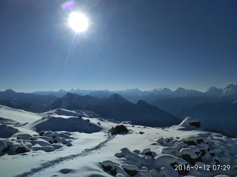 Навстречу спускались заснеженные группы, те, которые ночью ушли в звёздное небо. Непогода накрыла их буквально перед рассветом. Одна из групп не дошла до вершины метров 100. Жаль, что не дошли совсем чуть-чуть, но хорошо, что успели спуститься. Никто не потерялся.
