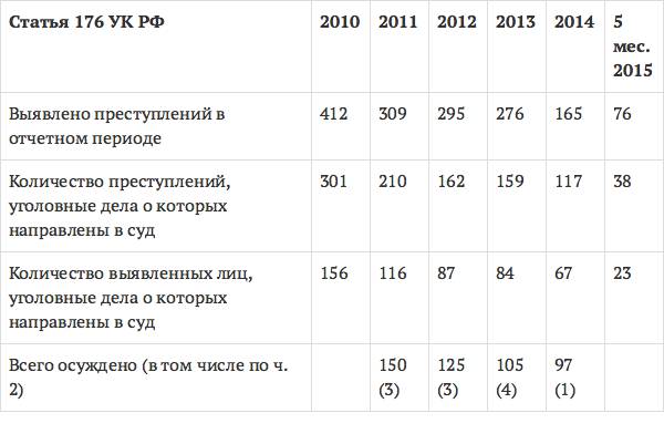 Говоря о статистических данных по ч. 2 ст. 176 УК РФ, отметим, что они также не блещут высокими показателями. К тому же отдельного учета по различным частям данной статьи не ведется, поэтому приведем лишь обобщенные цифры, характеризующие правоприменение по всей рассматриваемой норме, учитывая, что от 95 до 99 % показателей – это цифры по ч. 1 ст. 176 УК РФ, не имеющей отношения к государственным финансовым средствам. Обращаясь к статистике судебной, отметим, что за 2011–2014 гг. по ч. 2 ст. 176 было осуждено 11 чел.