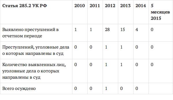 Об «эффективности» данной уголовно-правовой нормы говорит приведенная ниже статистика. Один осужденный за последние пять с половиной лет и единичные дела, работая по которым, невозможно ни сформировать надлежащую правоприменительную, ни тем более судебную практики.