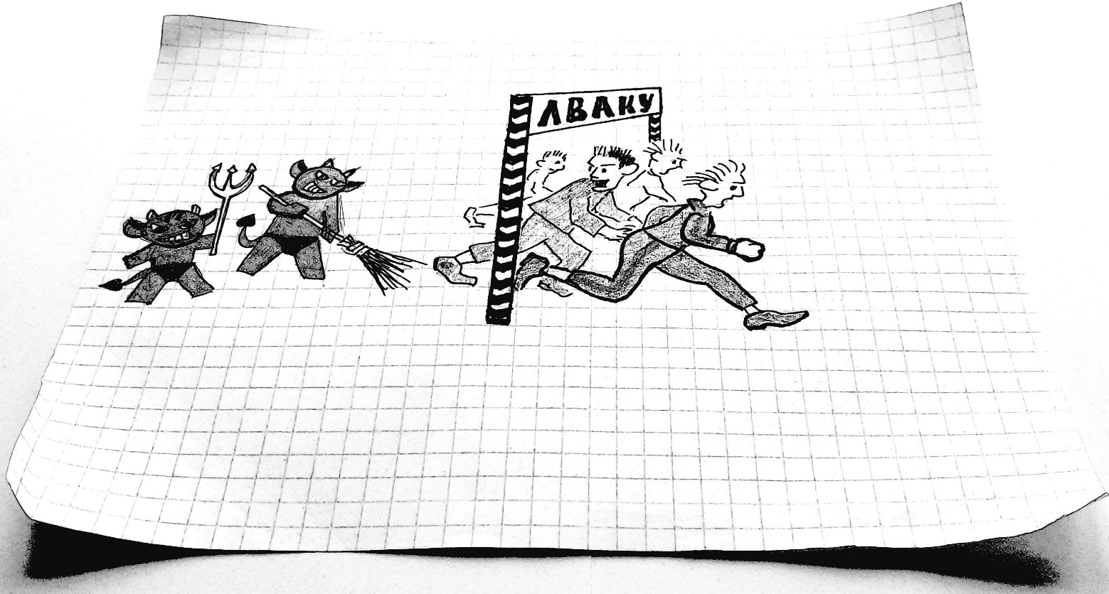 Сев за парту, взял учебник и стал читать. Как назло, ничего не лезло в голову. Посмотрел на Серегу. Тот, от усердия высунув кончик языка, рисовал на листке, довольно-таки сносно, смешных чертей с рогами и хвостами. Черти, держа в руках метлы, и что-то напоминающее вилы, гнали из распахнутых ворот, над которыми красовалась надпись «ЛВАКУ», несколько ушастых человечков.