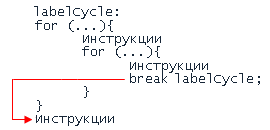 Несмотря на то, что метка может быть установлена перед любой инструкцией, на практике имеет смысл применять метки только перед циклическими конструкциями for, while, do, условными конструкциями if, switch и блоками {}. Чтобы «выбраться» из вложенного цикла или блока, достаточно снабдить меткой соответствующий внешний блок и указать её в команде break, которая передаёт управление первой инструкции, следующей за блоком.