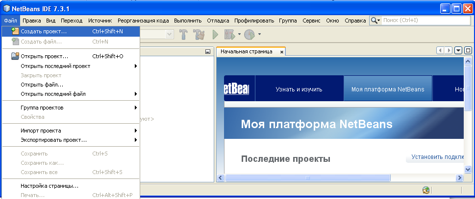 Для создания консольной программы необходимо выбрать в меню опцию «Файл» – «Создать проект»: