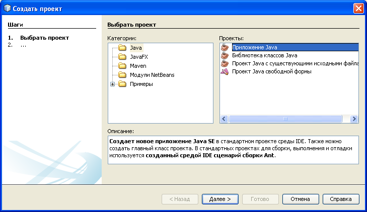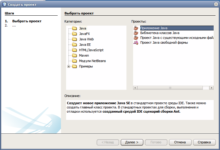 Выбираем категорию "Java", тип проекта "Приложение Java":