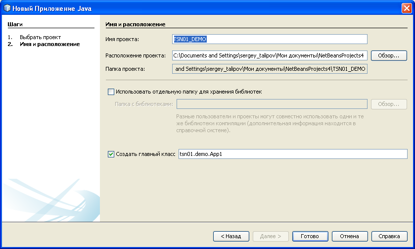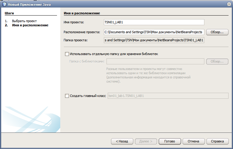 Указываем имя проекта. Имя проекта необходимо задать по шаблону «TSN01_LAB1», где «TSN» – инициалы автора программы большими буквами, «01» – номер варианта (2 цифры), далее идет знак «_», слово «LAB» большими буквами и номер лабораторной работы. При необходимости указываем новый каталог для расположения проекта. Нажимаем кнопку «Готово».