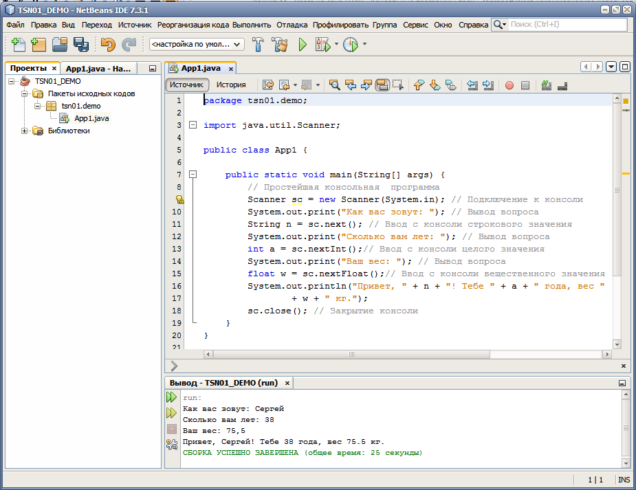 Консольные программы на Java – это наиболее простой вид программ, не имеющих собственного графического интерфейса, весь ввод и вывод информации происходит в окне консоли. В настоящее время консольные программы не имеют особого практического применения, их заменяют программами с графическим интерфейсом.