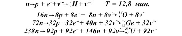 Опишем образования элементарного вещества космических тел Солнечной системы в результате взрыва нейтронной звезды, с использованием формул ядерных реакций. Образования элементов происходят в результате β-распада нейтронов. При распаде единичного нейтрона образуется водород [Емельянова, 1958] При образовании протонов в сгустках нейтронов происходит образование ядер атомов, например, по реакциям рис.2 образуются кислород, германий, уран.