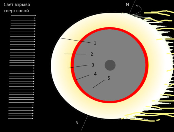 Рис. 3. Планета Земля, облучаемая взрывом сверхновой: 1-ионизированный слой; 2-слой атомарных элементов; 3-слой химических соединений; 4-океан расплавленной породы; 5-порода, не подвергнутая воздействию облучения.