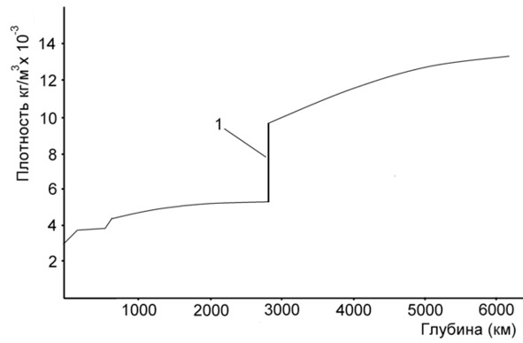 Рис. 18. Изменение плотности пород Земли с глубиной. 1- скачок плотности между мантией и ядром Земли