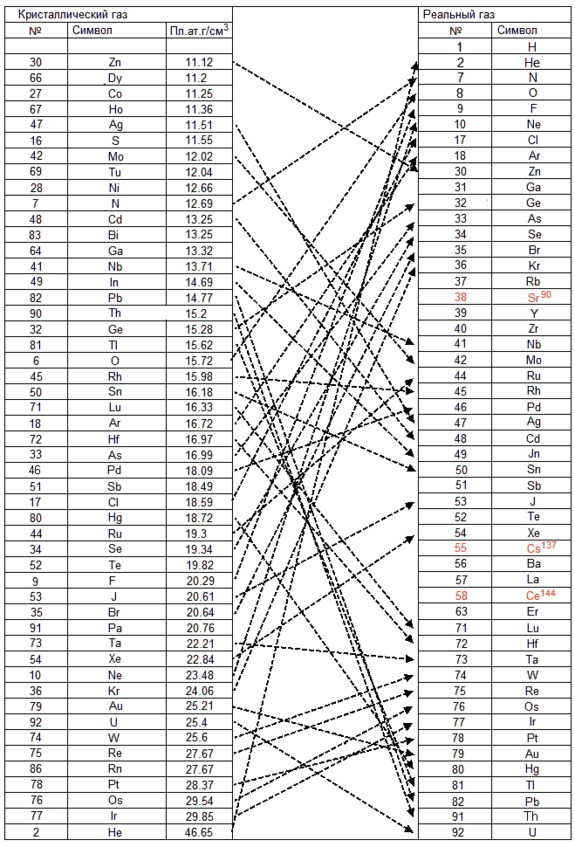 В таблице показана последовательность расположения слоёв элементов в начальной и конечной стадии перестановки слоёв элементов ядра Земли, при переходе из кристаллического газа в реальный газ (в таблице ряд элементов, слои ионизированных элементов, а также слои изотопов не показаны).