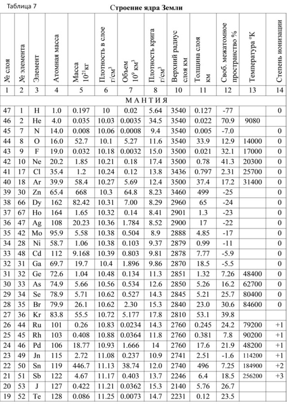 В таблице показаны рассчитанные параметры слоёв с достаточно большой точностью, но эта точность всего лишь результат математических вычислений значений. Реальная картина может несколько отличаться, тем более, что в ядре Земли постоянно протекают множество процессов, например, распадаются радиоактивные элементы, идут некоторые цепные реакции, от излучений образуются новые элементы, от повышения температуры элементы из состояния кристаллического газа переходят в состояние реального газа, снижают свою плотность и перетекают на другой горизонт, образуя другой слой. Кроме того, некоторые элементы, как водород и гелий, выходят из ядра Земли, а другие погружаются в ядро как продукты распада веществ мантии.
