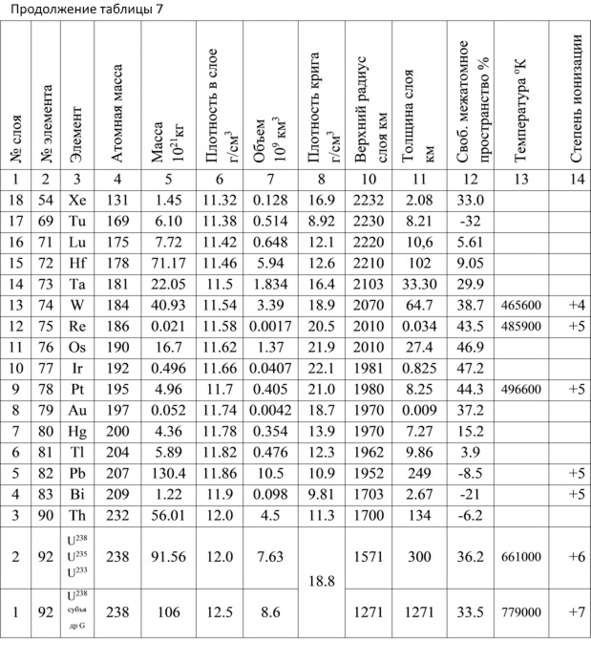В расчёте принято, что практически все количество тяжелых элементов состава Земли находится в ядре и соответствует процентному составу элементов Земли, показанному в гипотезе №4 Реальный состав элементов Солнечной системы (Нуклонная концепция) [Тимофеев 2013а, Тимофеев 2013в]. Этот состав получен по методу, основанному на использовании в расчетах энергии связей нуклонов в ядрах атомов элементов. По процентному составу и массе Земли (5976Е+21кг) определена масса каждого элемента в планете и показана в столбце 5. В мантии и коре Земли количество тяжелых элементов небольшое, оно укладывается в величину погрешности расчетов и при рассмотрении строения ядра не учитывается. В столбце 6 показана ориентировочная плотность элементов в слоях, взятая из результатов сейсмических исследований ядра Земли на соответствующих глубинах. Используя величины количества элементов в слоях и их плотности, рассчитаны объемы, занимаемые элементами в ядре Земли, показаны в столбце 7. Для определения положения слоя элемента в ядре Земли, рассчитаны плотности элементов в состоянии кристаллического газа. Учитывая, что при максимально плотной гексагональной укладке атомы занимают 74.05% объема вещества, а 25.95% объема вещества составляет межатомное пространство, плотность кристаллического газа составит 0.7405 от плотности соответствующего атома. Расчётные значения плотностей кристаллических газов показаны в столбце 8.
