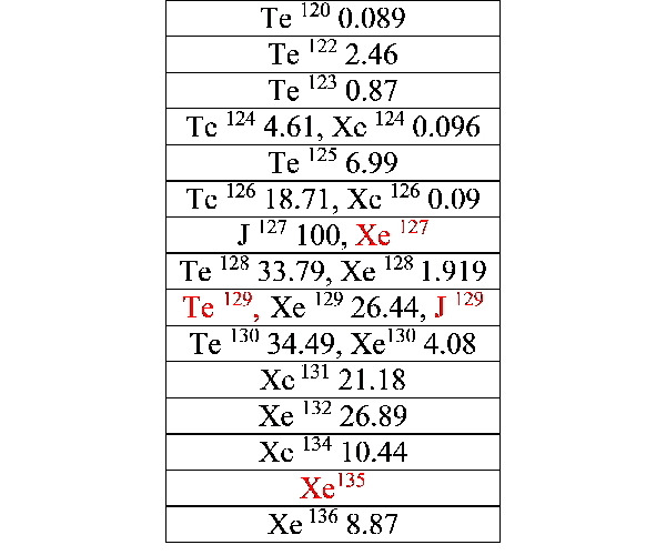 Изображение с учётом изотопов даёт более сложную картину слоёв, чем по слоям элементов. Ещё более сложная картина получается если учесть и нестабильные (радиоактивные) изотопы J 129, Хе 127, Хе135, Те 129 и т. д., образующиеся как осколки деления при цепных реакциях или как продукты спонтанного деления ядер.