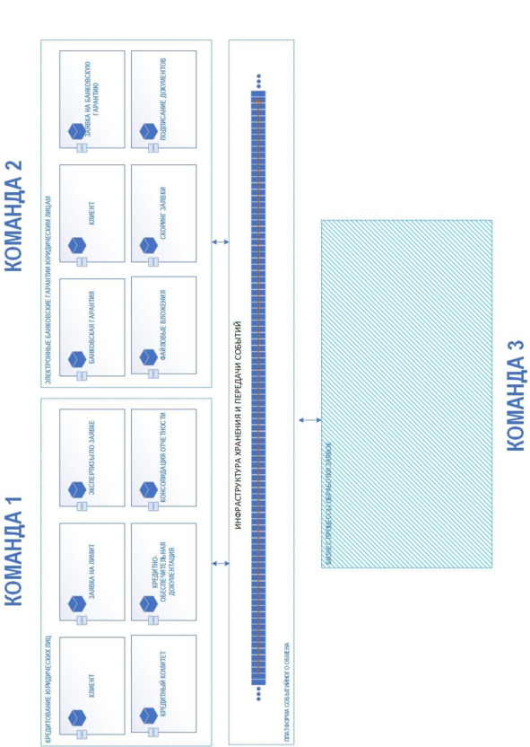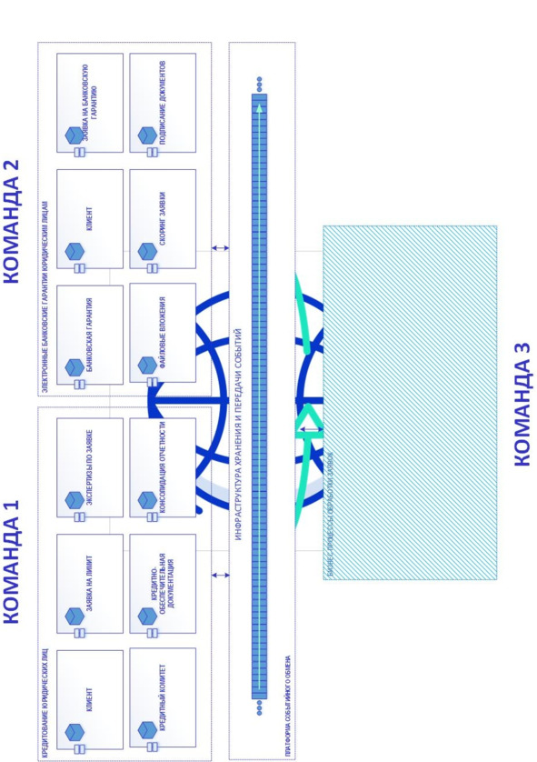 Для иллюстрации взят пример продукта – электронной банковской гарантии – и один бизнес-процесс – заведение банковской гарантии. В соответствии с ранее представленными подходами к проектированию, управление бизнес-процессом реализовано в формате микросервиса. Отметим, что бизнес-процесс как управляющий компонент (в отличие от компонентов, непосредственно выполняющих бизнес-действия), вынесен за пределы продуктовой области и взаимодействует с продуктовыми микросервисами посредством платформы событийного обмена. Структура автоматизации продуктовых бизнес-процессов выглядит следующим образом: