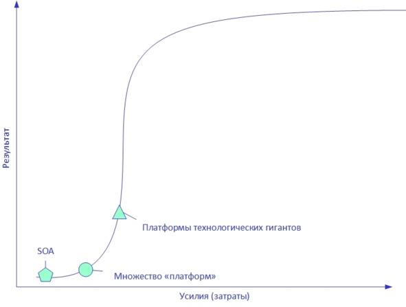 Фактически, если применять закон S-кривой и взять за старт последней классическую SOA-архитектуру, то можно констатировать, что рассмотренный выше пример платформенного подхода, заключающийся в использовании множества «платформ», находится на рабочем подготовительном этапе (значительные инвестиции с невысоким результатом), при этом использование современной платформы относится к этапу интенсивного внедрения технологий. Говорить об этапе стагнации платформенного подхода пока рано, поскольку рынок автоматизации нельзя считать насыщенным современными платформенными технологиями (речь идет именно о полноценных цифровых платформах, а не о частных «платформах», которые скорее осложняют автоматизацию). Схематично развитие платформенного подхода представлено на Рисунке 3.