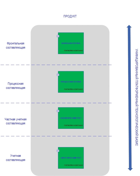 На Рисунке 5 обезличенно показаны два продукта, автоматизируемые при помощи платформы. Для наглядности изложения мы предположим, что продукты, как и в ранее рассматриваемом примере, содержат учетную (отвечающую за синтетический учет), частную учетную (отвечающую за аналитический учет), процессную (отвечающую за исполнение бизнес-процессов, связанных с соответствующим продуктом) и фронтальную (отвечающую за клиентское представление продукта) составляющие. При этом реализация каждой составляющей определяется собственным платформенным приложением, но может использовать подобный (а в отдельных случаях и идентичный) набор платформенных сервисов. Мы видим, что уже на текущем этапе платформа позволяет схожим образом структурировать продукты (выделить общие составляющие) и использовать схожие платформенные сервисы и компоненты для их автоматизации. Таким образом, архитектурная организация продуктов уже упрощается, снижая избыточные трудозатраты, неизбежные при полностью независимой автоматизации.
