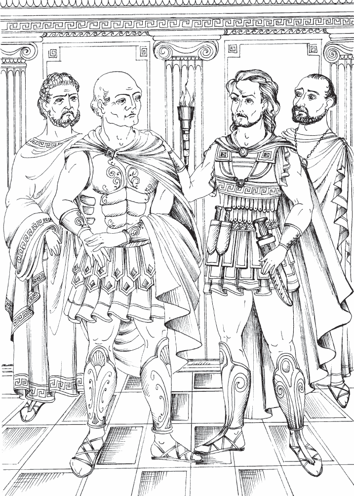 Ксантипп продолжал стоять в центре, сложив руки на груди. Про него на время забыли. Но уйти никто не предложил, поэтому он решил посмотреть на посольство римлян. Римляне, около десяти человек, гордо вошли в зал. Они были одеты не как послы, а как воины. Возглавлял посольство крепкий, лысеющий человек с обветренным лицом и в позолоченных доспехах.
