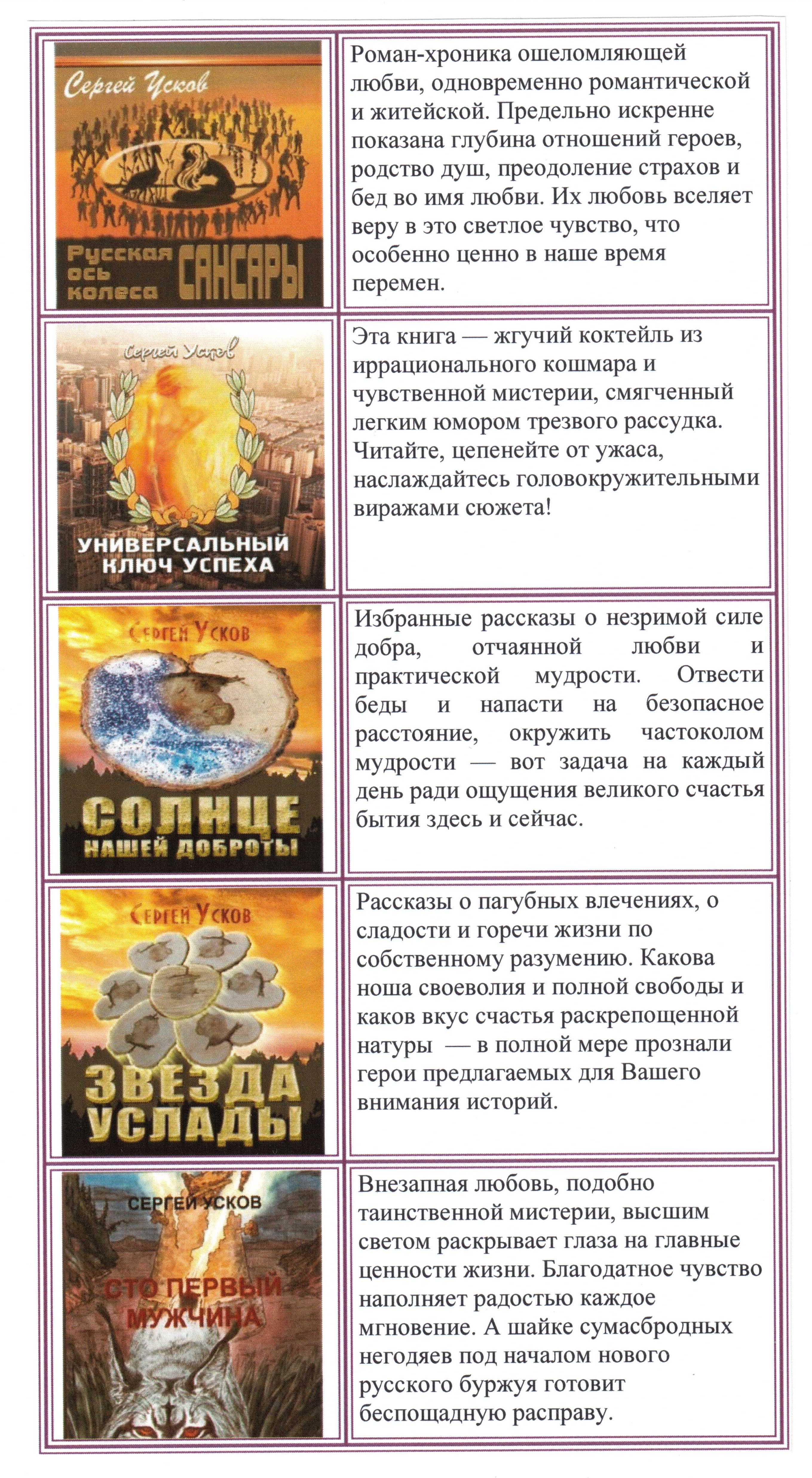 Изданы книги: «Русская ось колеса Сансары» редакции 2016 года, «Универсальный ключ успеха», «Сто первый мужчина», «Солнце нашей доброты», «Звезда услады». Их можно найти в ЛитРесе и на других электронных ресурсах.