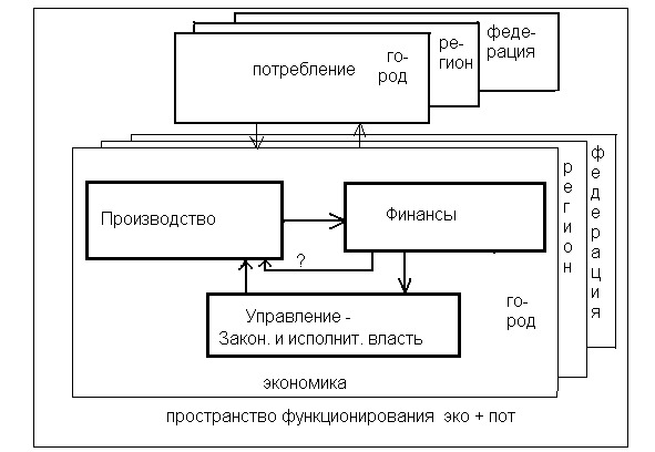 На рис. 3 представлена собственно экономика в виде триады: производство, финансы, управление, а потребление вынесено из этой триады. Экономика и потребление имеют иерархическую структуру – город, регион, федерация. Нет в схеме и конкретного индивидуума. В литературе часто потребление включают в этот «круговорот» экономики, но по условию потреблением напрямую управлять нельзя, поэтому оно, и вынесено из цикла. Структура экономики в представленной форме инвариантна к любому уровню иерархии от частного предпринимателя до федерации. В представленной схеме потребление связано с экономикой входной и выходной информацией в каждом конкретном случае и на каждом уровне.