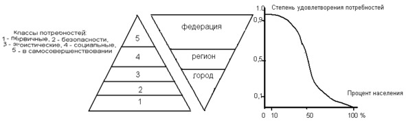 На рис. 4 в перевернутой пирамиде показано, что власть на уровне города, а это местное самоуправление, отвечает за 1 – ый, 2 – ой и часть 3 – го классов потребностей, на уровне региона – оставшуюся часть от 3 – го класса и большую часть 4 – го класса, а на уровне федерации – остаток от 4 – го класса и весь 5 – й класс. Это довольно условное распределение обязанностей, оно далеко не соответствует тому, что прописано в законе ФЗ №131 2003 г. Тем не менее, как показано выше, задача обеспечить жильем малоимущих возложена на местное самоуправление. Это относится к классу первичных потребностей и в самозащите, и отвечать за это могут только на местах – они знают «кому», а вот где взять средства – это относится федеральному уровню. Поскольку только на этом уровне можно решать задачу выравнивания территории страны по уровню жизни граждан – вопрос целостности страны. Попутно следует отметить, что местное самоуправление, в том виде как оно понимается на местах, относится к самоорганизующимся системам, для которых все внешние воздействия случайны. В природе – это пчелы, муравьи и те же древнеримские муниципии. Всем им присуще свойство вороватости – это скорее эгоизм. Согласно приведенному выше опросу видимо современное общество не очень далеко ушло от древних.