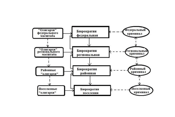 Обязательным элементом любой федерации является наличие криминала. В различных источниках по-разному описывают его структуру и подчинённость. Можно утверждать одно, что он тоже имеет интегрированную структуру, а вот связи между уровнями и властью самые различные. Поэтому все связи показаны пунктирными стрелками. Как влияет криминал на власть – сказать трудно. То, что – это взаимное влияние, примеров предостаточно.