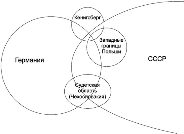 Образно-географическая карта обсуждения границ Германии на переговорах Черчилля, Сталина и Трумэна во время Потсдамской мирной конференции 1945 г. (Замятин, 1998)