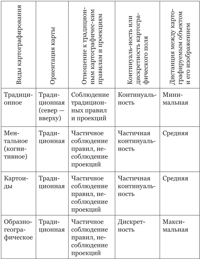 Направленность на содержательные знаково-символические репрезентации географического пространства определяет дискретность картографического поля образно-географической карты и частичное и необязательное соблюдение традиционной для европейской картографии Нового времени ориентации по сторонам света (см. таблицу). По таким параметрам как отношение к традиционным картографическим правилам и проекциям и дистанция между картографируемым объектом и его изображением образно-географические карты близки к ментальным (когнитивным) картам и картоидам.