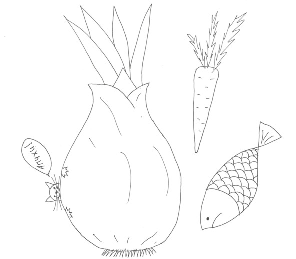 Соседский котенок влез через форточку к Папе на кухню, когда Папа резал лук для ухи. Котенок явно рассчитывал на рыбу, но от лука расчихался.