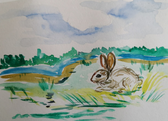 Спустился с горы, а снизу тропка глинистая, песочная. На солнце песочек заливается красно-коричневым цветом. Красивый, пестрый лес, все зелено и сочно. Тропа все илистее, темнее и вязче. И вдруг болото перед ним. Большое, непролазное, с камышами. Зайка вокруг болота и так, и так крутился. И лапку сунет, так и вязнет в пучине ила, засасывает и тянет вниз.