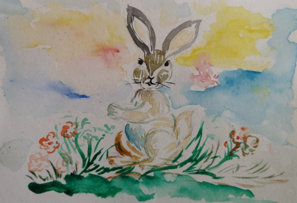 Лето жаркое выдалось, солнце светит, ослепляет все вокруг. Жарко, как в печке, в которой печется душистый ароматный хлеб. Вся природа радуется. Все цветет и благоухает. Тепло на душе у зайки, уютно. Как вдруг откуда ни возьмись- высокие огромные горы. Остановился зайка возле гор и рядом бегает, и вверх не решается подниматься. Вдруг за горами серый закрался и неизвестно, кто еще за горой. Ничего за ней не видно, страшно. Кружился он у горки, кружился. Куда дальше идти и как непонятно.