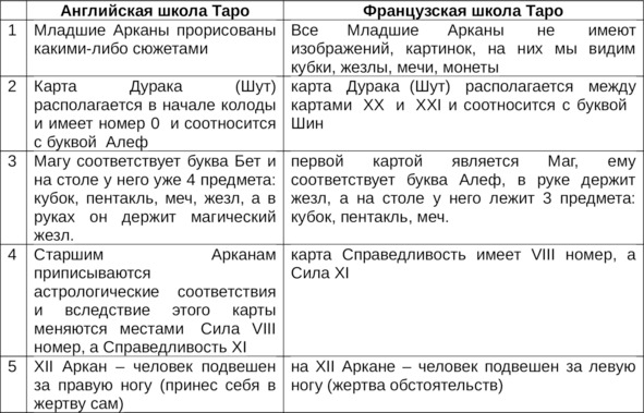 То есть, каковы же пять основных различий между французской и английской системами (школами) Таро: