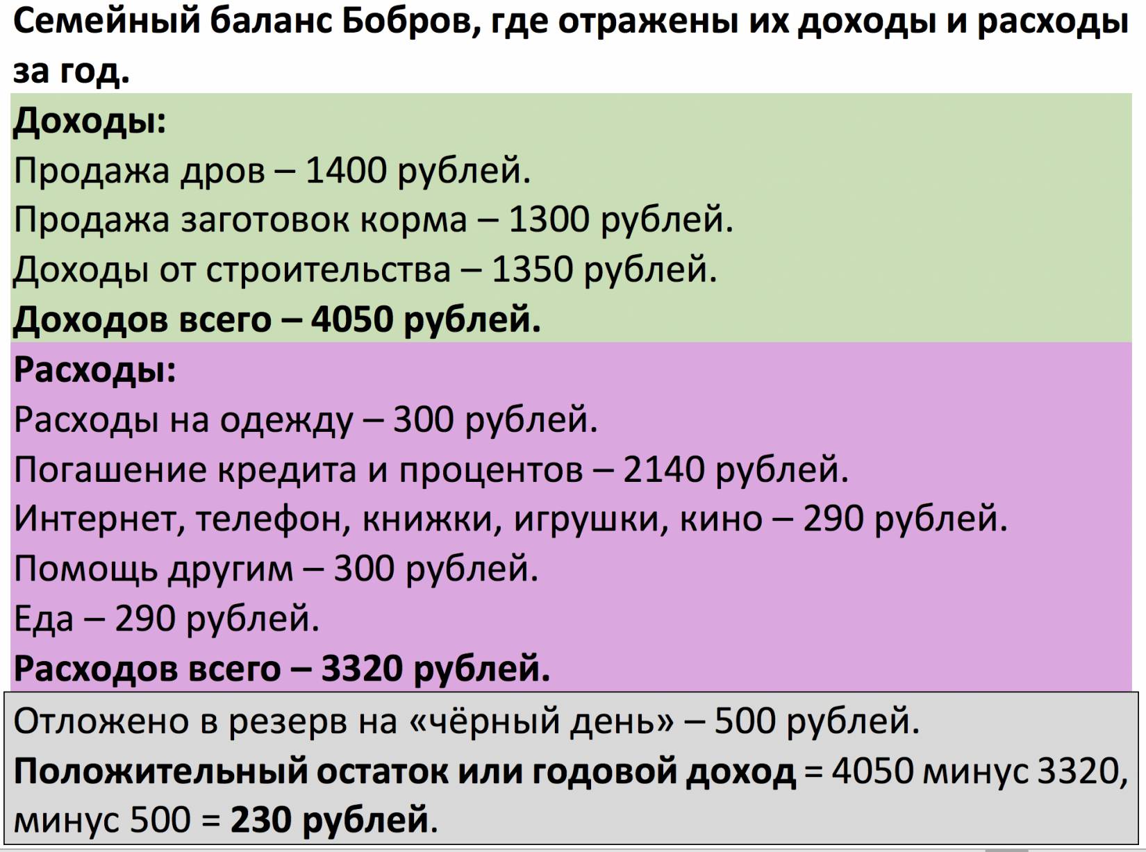 – Я расскажу, как мы это делаем, – предложил дедушка бобрят. – Мы продаём дрова и излишки своей еды. А ещё мы работаем в других хозяйствах и помогаем им строить дома и норки. Это наши доходы. Мы считаем, сколько денег получаем от этих продаж. Потом мы считаем, сколько нам надо денег на еду, одежду, проценты банку за кредит, расходы на обучение бобрят, лечение, игрушки, книжки, оплату Интернета, телефона, ну и что-то ещё, что может понадобиться. Главное, надо учесть все расходы