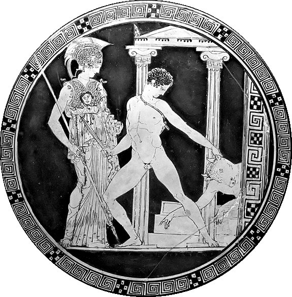 Тесей, убивающий Минотавра, и Афина. Краснофигурный килик. 425–410 гг. до н. э.