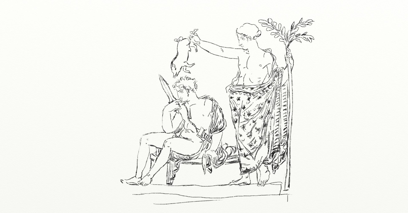 “Сойдя благополучно на землю, они принесли жертву Зевсу-Фиксию (“дающему убежище”) и отправились на молитву в святилище Фемиды на реке Кефисс, крыша которого была покрыта водорослями, а алтарь давно остыл.