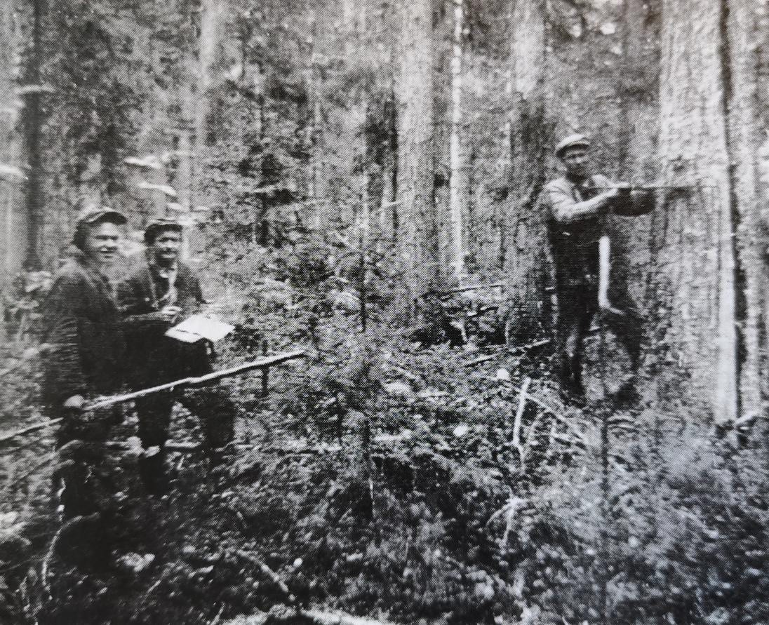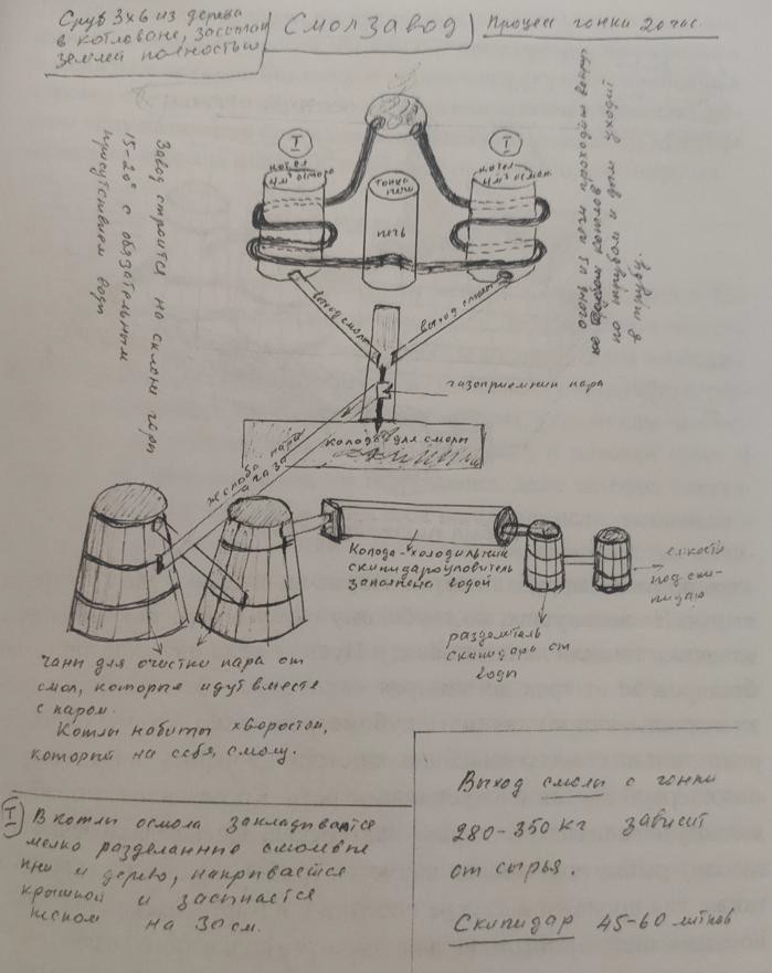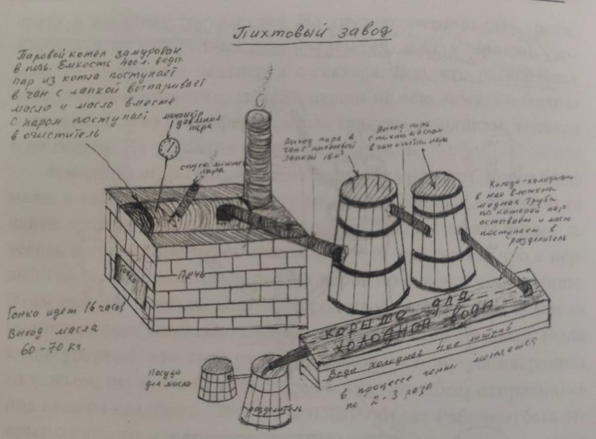 Пихтовый завод давал в сутки пятьдесят – шестьдесят килограмм масла. Лапки к заводу доставляли девушки. Они с топором лазали по огромным пихтам и обрубали ветки. Норма на человека два кубометра сырья. На волокушах, по глубокому снегу и в трескучий мороз, девчонки тащили лапки к заводу. Путь лежал по глухой тайге, по бездорожью от трёх до четырёх километров. За один раз в топку закладывали по двадцать кубометров лапки. На это чудо инженерной мысли следует посмотреть.