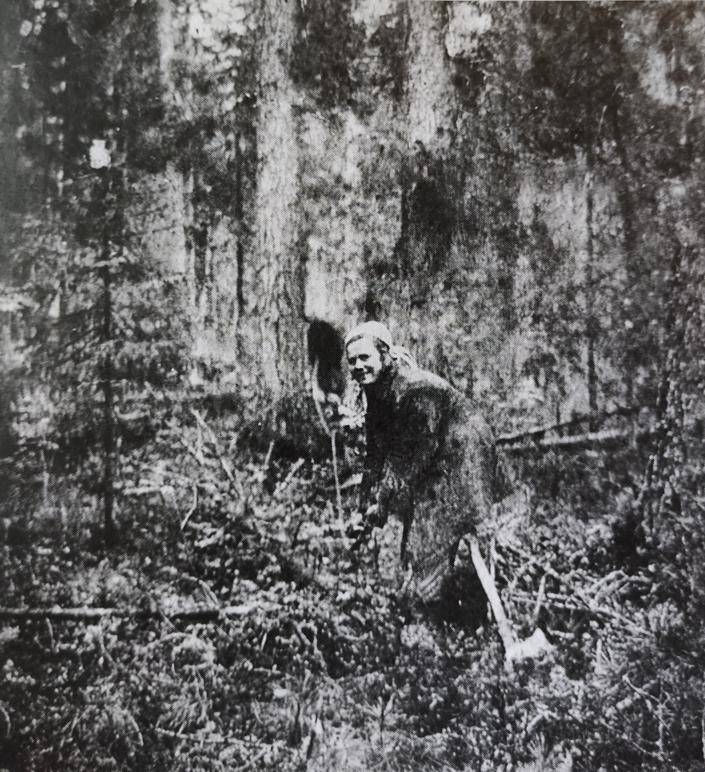 Мы с Ефимом взяли продукты, топоры, пилу и отправились к месту работы. К вечеру, вырубив визиру до реки, остановились на ночлег. днём прошёл сильный дождь, и ночью было очень холодно. Мы сильно устали и вымокли, но повезло – убили рябчика. Его сварили с пшеном и хорошо поужинали. На ночь соорудили ладью, чтобы огонь горел до утра. Развесили одежду и обувь на просушку, натаскали на постель пихтовых лапок, улеглись и уснули, как убитые.