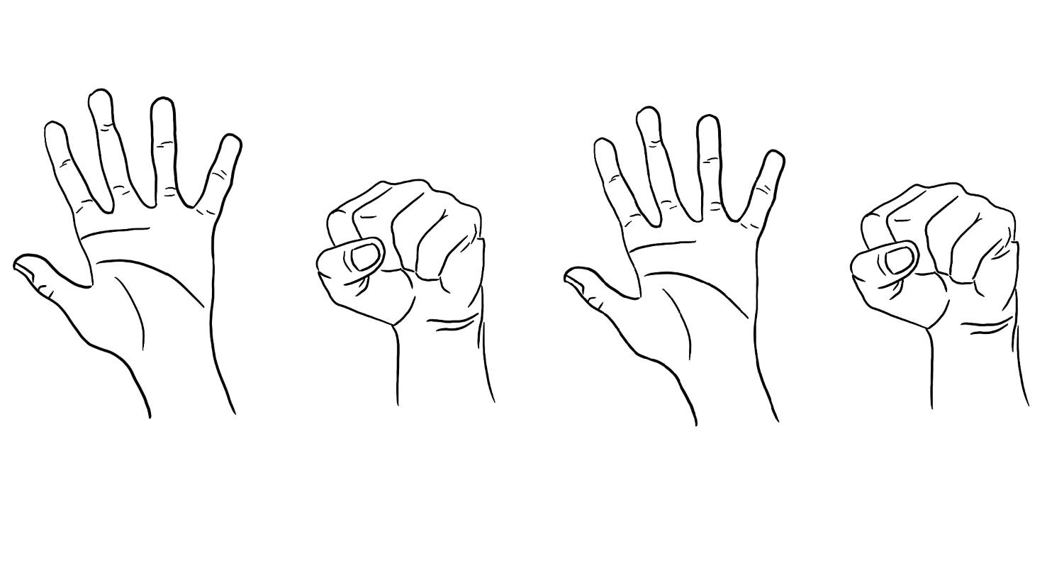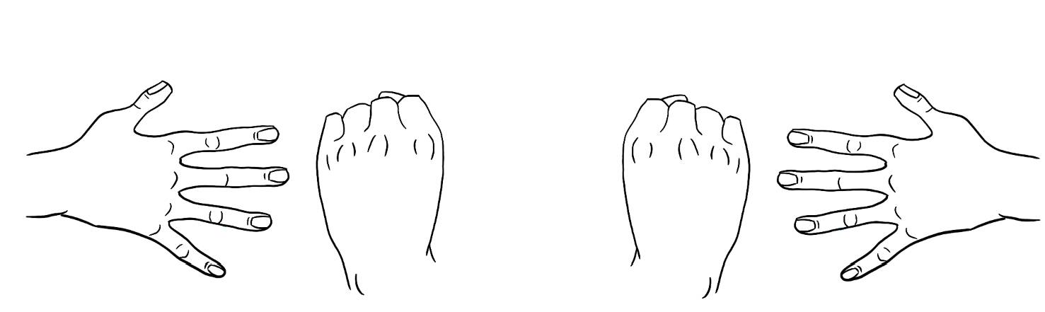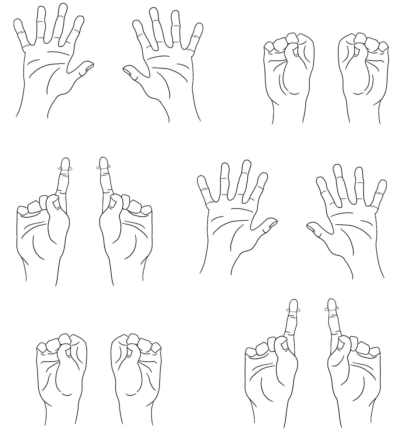 Пальцы согнуты в кулак, разгибаем все пальцы по одному, начиная с большого пальца. Затем обратно собираем пальцы в кулак, начиная с мизинца.