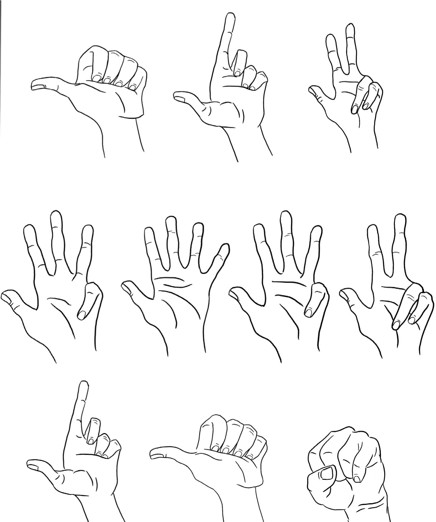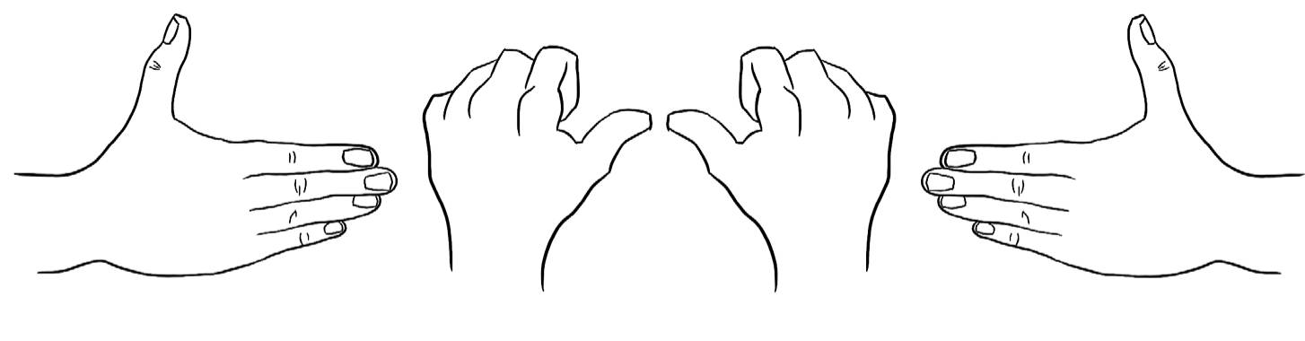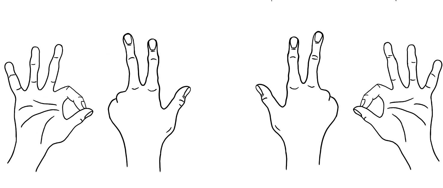 Пальцы правой руки расставлены широко («солнышко»), пальцы повернуты в сторону, ладонь повернута к себе.