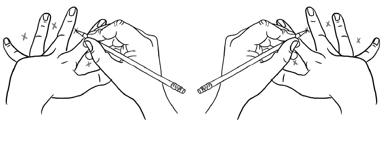 Возьмите карандаш или ручку в одну руку. Пальца другой руки широко расставлены и лежат на столе, ладонью вниз.